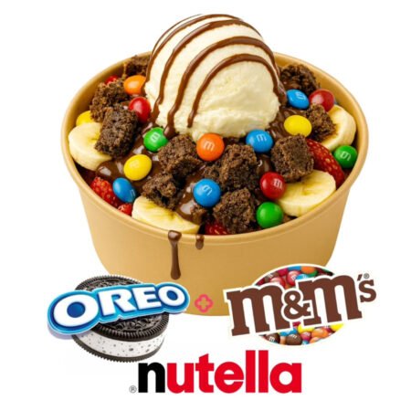 Un bowl lleno de antojos: trozos de waffle, nutella, fresa, banano, M&M´s, trozos de brownie,…$25,000 -
